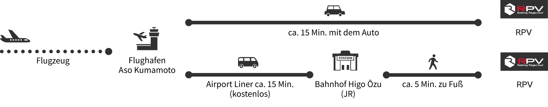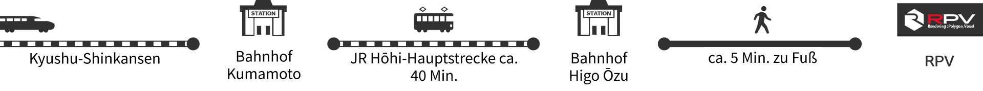 | Informationen über den Zugang zum Verkehr | 15 Minuten Fahrt vom Flughafen Aso Kumamoto. Vom Flughafen Aso Kumamoto, ca. 15 Minuten mit dem Airport Liner, ca. 5 Minuten Fußweg vom Bahnhof Higo Otsu. |